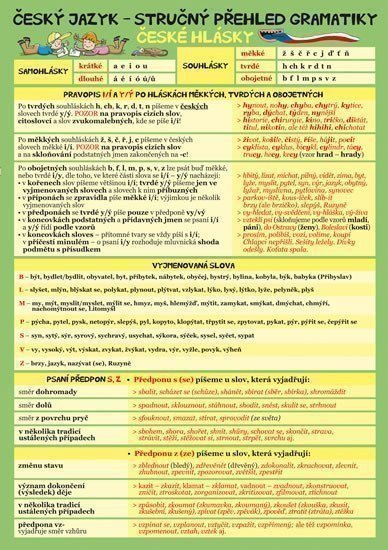Laminátová skládačka určená především pro žáky základních a středních škol nabízí graficky přehledný a stručný přehled gramatiky českého jazyka. Obsahuje praktické návody na psaní i/y, s/z, ú/ů, mě/mně i s příklady, vyjmenovaná slova, popis a dělení jednotlivých slovních druhů, skloňování podstatných a přídavných jmen, zájmen a číslovek, časování sloves, základní přehled i určování větných členů a hlavních i vedlejších vět.